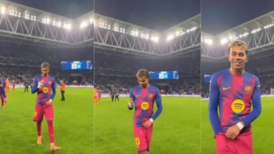 - •बार्सिलोना के युवा खिलाड़ी लामिन यामाल ने जीत के बाद 'थ्री पॉइंट्स इन द पॉकेट' जश्न मनाया.